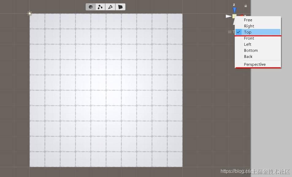 第2步:设置Scens视图中的“世界坐标系”为“正交视图”,且为 Top方式,详见上图。