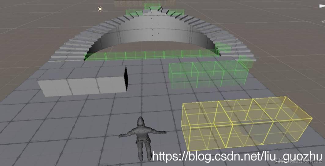 PB中对于碰撞检测与触发检测,有自己一套单独的组件,可以更好的配合使用。分别是Set Collider 与Set Trigger组件,下图的绿色部分为碰撞体,黄色为触发体。