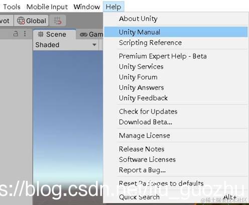 具体操作是,首先点击unity菜单的”Help”—>”Unity Manual” 在打开的网页中,可以通过输入关键词查询自己需要的更多内容,详细见下图。