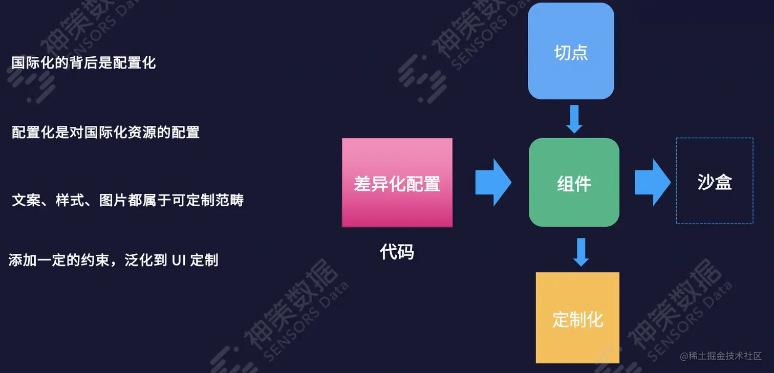 本质上是面向资源标识编写组件,完成扩展,运行时转化的过程输入是资源标识,输出是字符串,但是对于前端,可以扩展输出为一个前端组件,在组件内可以完成更多的能力,就比如和资源服务器的交互。 国际化背后是配置化,添加一定的约束后,配置化可以泛化到前端界面的局部定制。