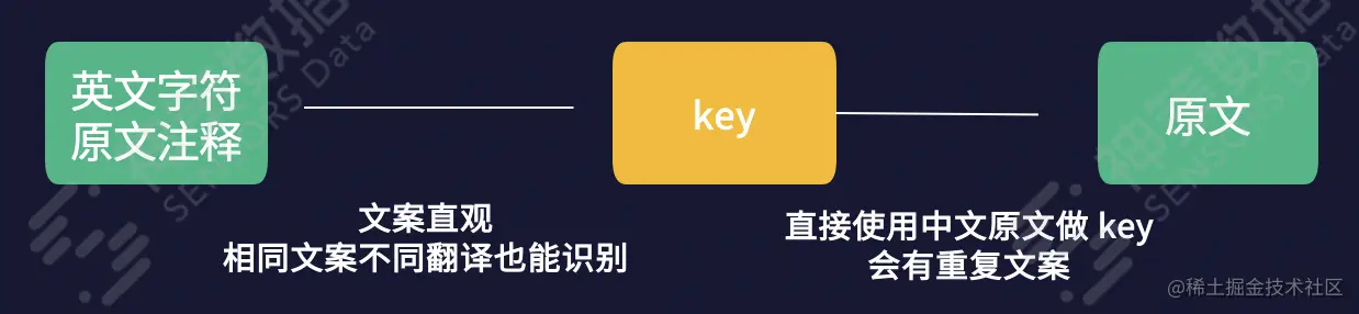 以上两种代表了两类编写方式:结构式标识、声明式 ID 标识,可以明显的看出,声明式的 ID 会更好一些。在这个基础上,还需要解决:文案直观、模块化的问题。既然中文更直观,能不能直接用中文呢?最好不要,中文会有一词多译的问题。可以用声明式的简短字符 ID+ 中文注释来标识,兼容声明式 ID 和结构式的优点。注释的部分可以通过脚本来实时更新为最新的中文。 模块化需要额外来支持,在 ID 中带有模块是一种方法,但是维护起来会容易出错,难以排查。可以通过配置文件,从脚本收集层面来后置的加入模块