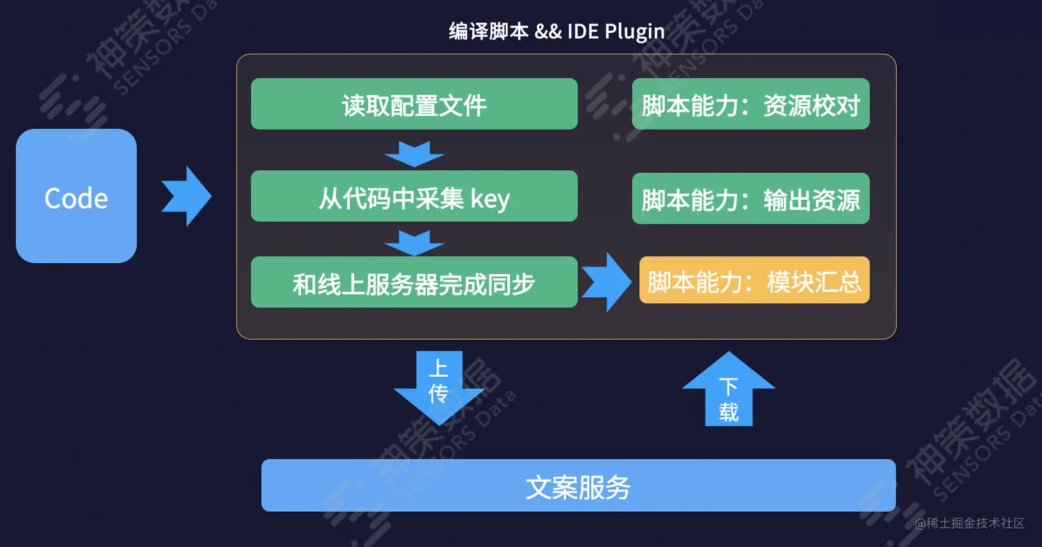 脚本工具的能力是关联代码和国际化资源服务。一条操作路径是:资源采集、模块化、上传到文案服务。另一条资源路径是,本地调试,从资源服务器读取翻译,写成文件到本地,本地依赖。 脚本工具可以以 cli 的形式存在,也可以以 IDE Plugin 形式存在。