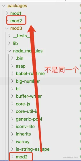 下图展示了lerna add mod2 --scope=mod3之后,cd packages/mod3 && yarn 时,会安装到错误的mod2(npm上一个错误的同名包),而不是我们预期的packages/mod2