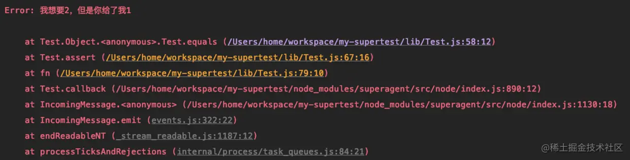 expect函数里根据入参要将_asssertStatus或_assertBody还是_assertHeaders推入_asserts数组里 end函数执行assert函数来执行所有_asserts里所有的断言回调,并对网络错误也做了相应的处理- 对抛出的错误 stack 也做了修改,更友好地展示错误