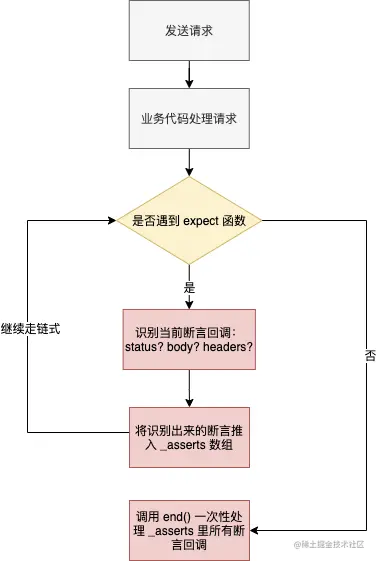我们还注意到一点 expect 函数有可能是用来检查状态码 status 的,有的是检查返回的 body,还有些检查 headers 的,因此每次调用 expect 函数除了要往 this._asserts 推入断言回调,还要判断所推入的断言回调到底是给 headers 断言、还是给 body 断言或者给 status 断言的。