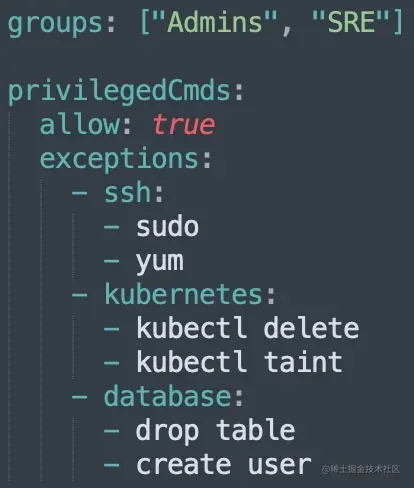 - 仅允许属于 Admins 和 SRE 组的个人在 SSH 服务器、Kubernetes 集群和数据库上运行特权命令。