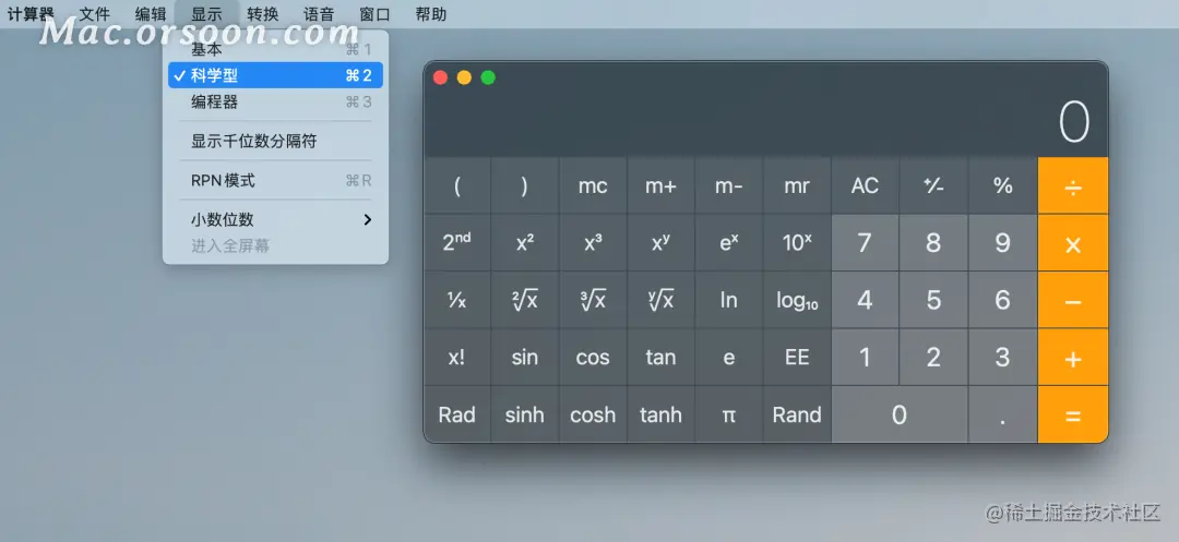 Mac 自带一个计算器软件。默认显示的比较简单。但是你可以通过快捷键 command-1、command-2、command-3 来切换成**「基本」、「科学形」、「编程器」**三种计算器状态。