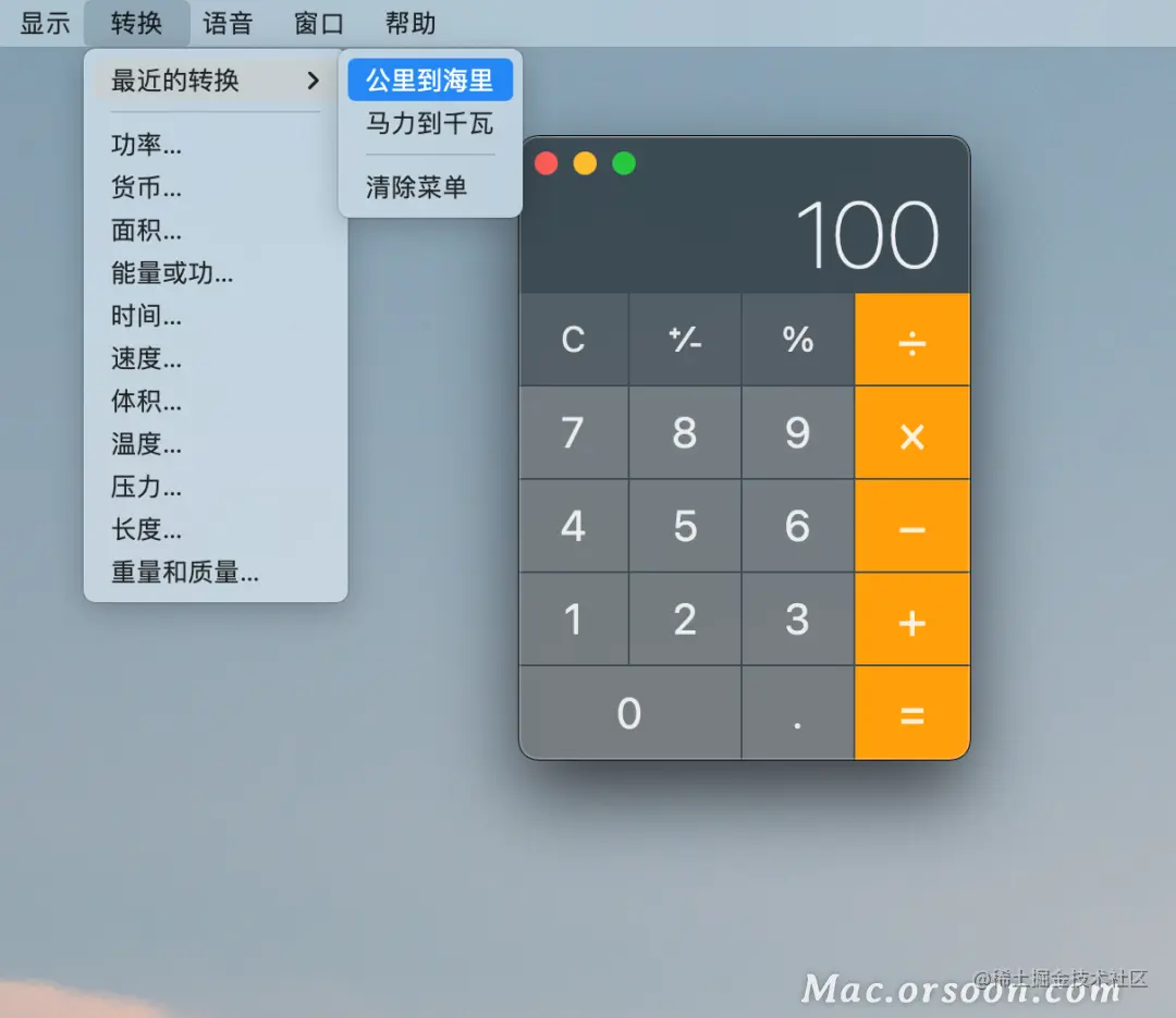 还可以利用计算器转换单位,比如输入 100,然后选择转换单位为「公里到海里」,计算器就会显示 100 公里对应的海里结果。里面有 11 种类型的单位转换。