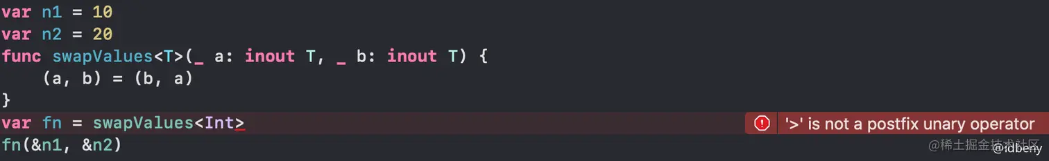 调用swapValues函数时后面不能写成swapValues<Int>(&n1, &n2),因为参数已经明确了要传入的是什么类型。