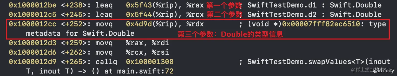 通过上面汇编可以看出,函数传入的参数除了两个外界传入的参数外,还传入另外一个元类型信息参数。函数内部就是根据这个元类型参数获取参数真正的类型是什么。