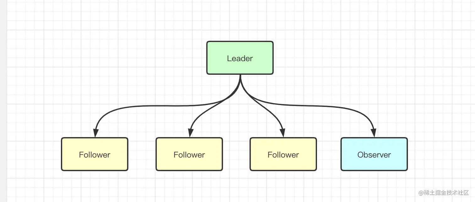 ZAB协议将Zookeeper集群中的节点划分成了三个角色,分别是Leader、Follower和Observer,如下图: