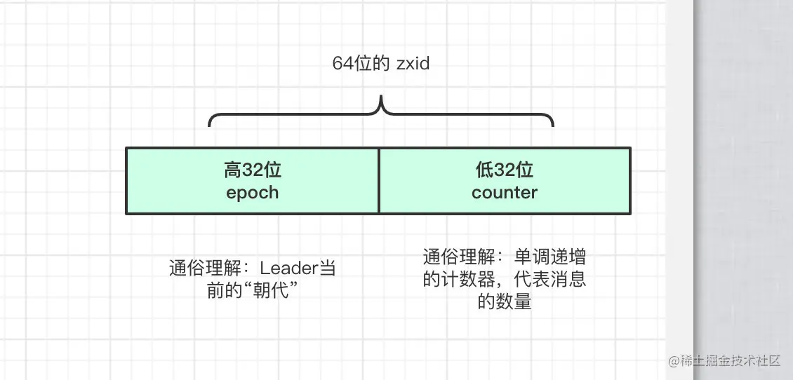 可以简单的把zxid理解成Zookeeper中消息的唯一ID,节点之间会通过发送**Proposal(事务提议)**来进行通信、数据同步,proposal中就会带上zxid和具体的数据(Message)。而zxid由两部分组成: