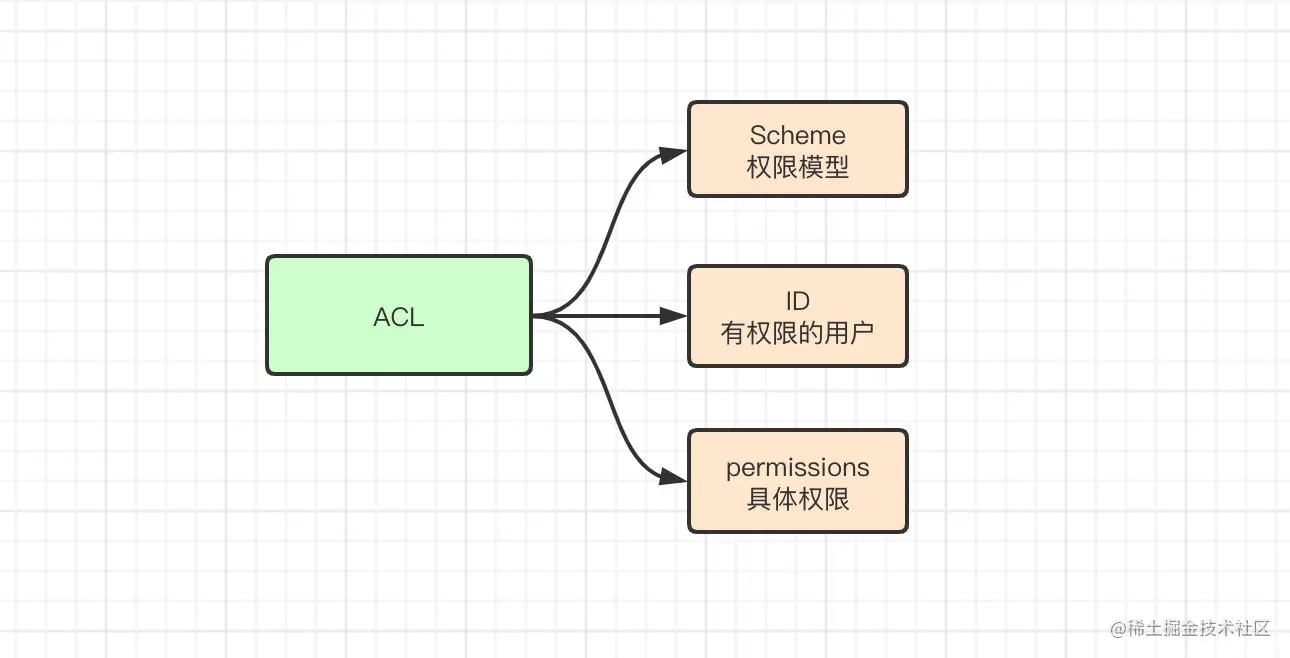 Zookeeper中虽然也是三段式,但是两者对粒度的划分存在区别。Zookeeper中的三段式为Scheme、ID、Permissions,含义分别为权限机制、允许访问的用户和具体的权限。