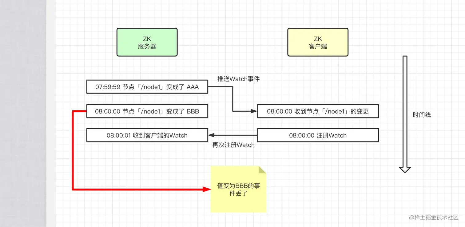 并且一次性的Watch会存在问题,因为在Watch触发的事件到达客户端、再到客户端设立新的Watch,是有一个时间间隔的。而如果在这个时间间隔中发生的变更,客户端则无法感知。