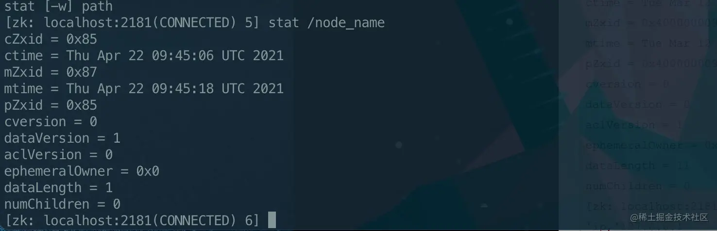 举个例子,通过stat命令,我们可以查看某个ZNode中Stat Structure具体的值。