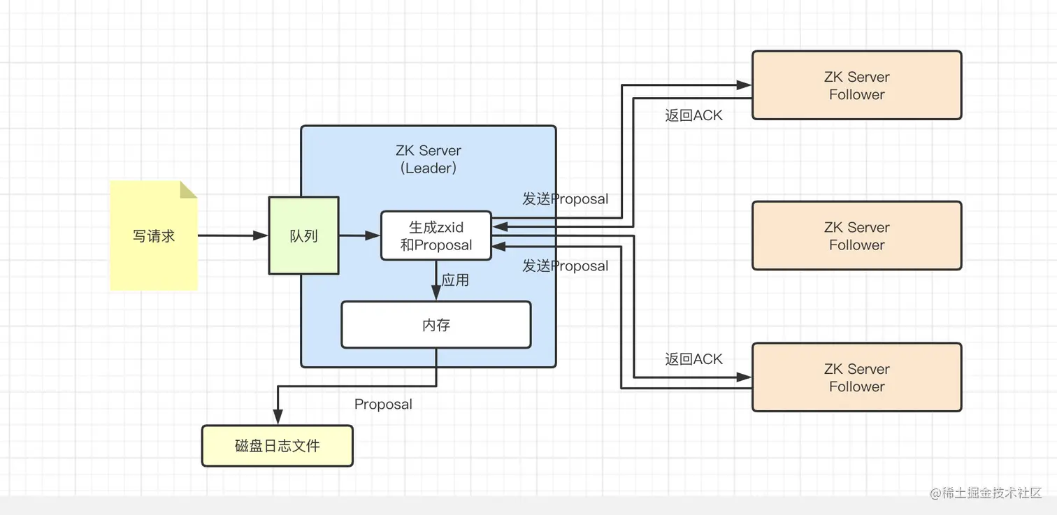 这样可能不是很直观,用大白话来说就是,超过半数的Follower返回了ACK,该Proposal就能够提交,并且应用至内存中的ZNode。
