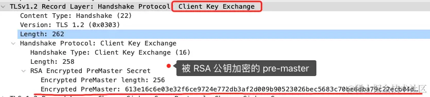 客户端验证完证书后,认为可信则继续往下走。接着,客户端就会生成一个新的随机数 (pre-master),用服务器的 RSA 公钥加密该随机数,通过「Change Cipher Key Exchange」消息传给服务端。