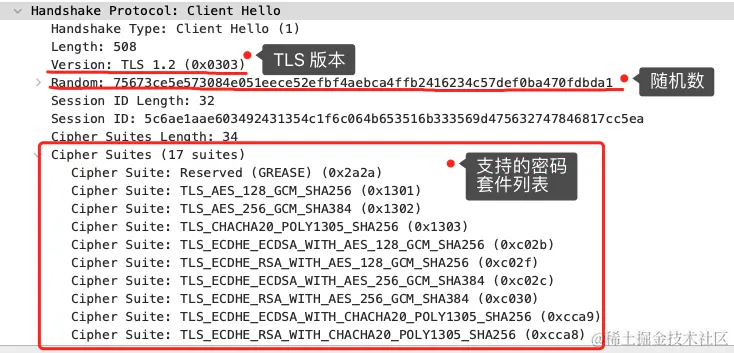 就前面这两个客户端和服务端相互「打招呼」的过程,客户端和服务端就已确认了 TLS 版本和使用的密码套件,而且你可能发现客户端和服务端都会各自生成一个随机数,并且还会把随机数传递给对方。