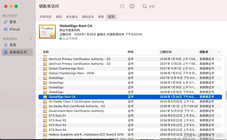 操作系统里一般都会内置一些根证书,比如我的 MAC 电脑里内置的根证书有这么多