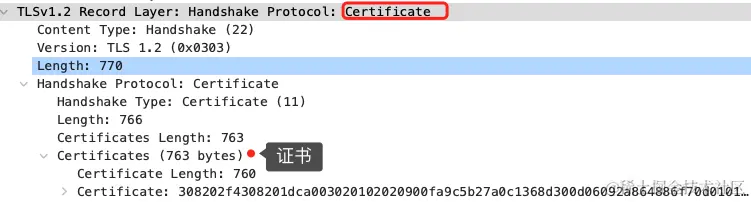 然后,服务端为了证明自己的身份,会发送「Server Certificate」给客户端,这个消息里含有数字证书。