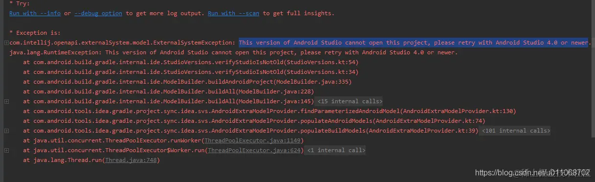 Android之提示This version of Android Studio cannot open this project, please retry with Android Studio chenyu 2021-04-28 254 阅读1分钟 1 问题 编译项目,错误提示如下 This version of Android Studio cannot open this project, please retry with Android Studio 2 解决办法 很明显,看英语翻译也知道,是由于AS版本太低导致,升级AS就可以了。