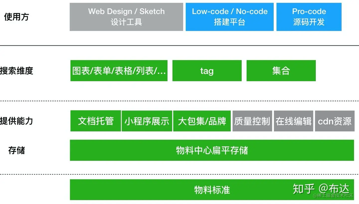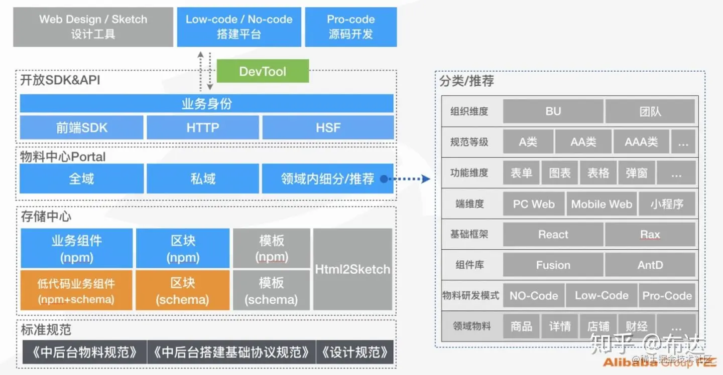 目前 ProCode 模式已经比较成熟了。而针对低代码搭建平台产出的 LowCode 模式的物料在未来更容易去流通,集团已经已经统一了《阿里经济体中后台搭建基础协议规范》,低代码平台产出的搭建物料都会流入物料中心,各大平台会按需从物料中心拉取合适自己业务线的物料。物料中心作为各平台物料互通的基座,需要做好存储、管控、搜索、透出等方面的事情,低代码物料可以通过集体提供的 ali-lowcode-engine 直接在线预览。