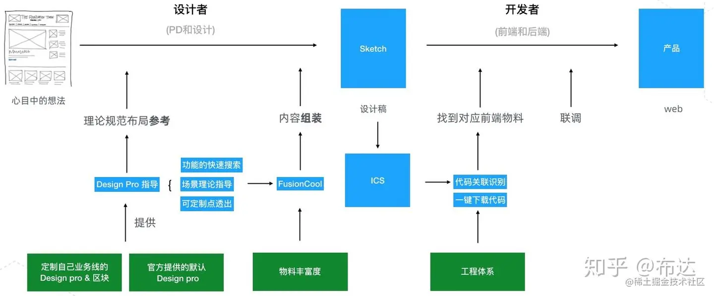当然对于前端来说能力的复用不仅仅是把函数、逻辑功能封装完就结束了,因为还有UI部分的沉淀,有UI就会涉及到设计和交互。所以在前端的能力复用路径中可能会涉及到产品、设计师、前端多个角色。这两年在集团内 Fusion 已经在前端组件体系这块已经收拢了设计规范、沉淀出组件能力,并且已经相对成熟了。我们开始思考如何进一步加快业务的开发速度。