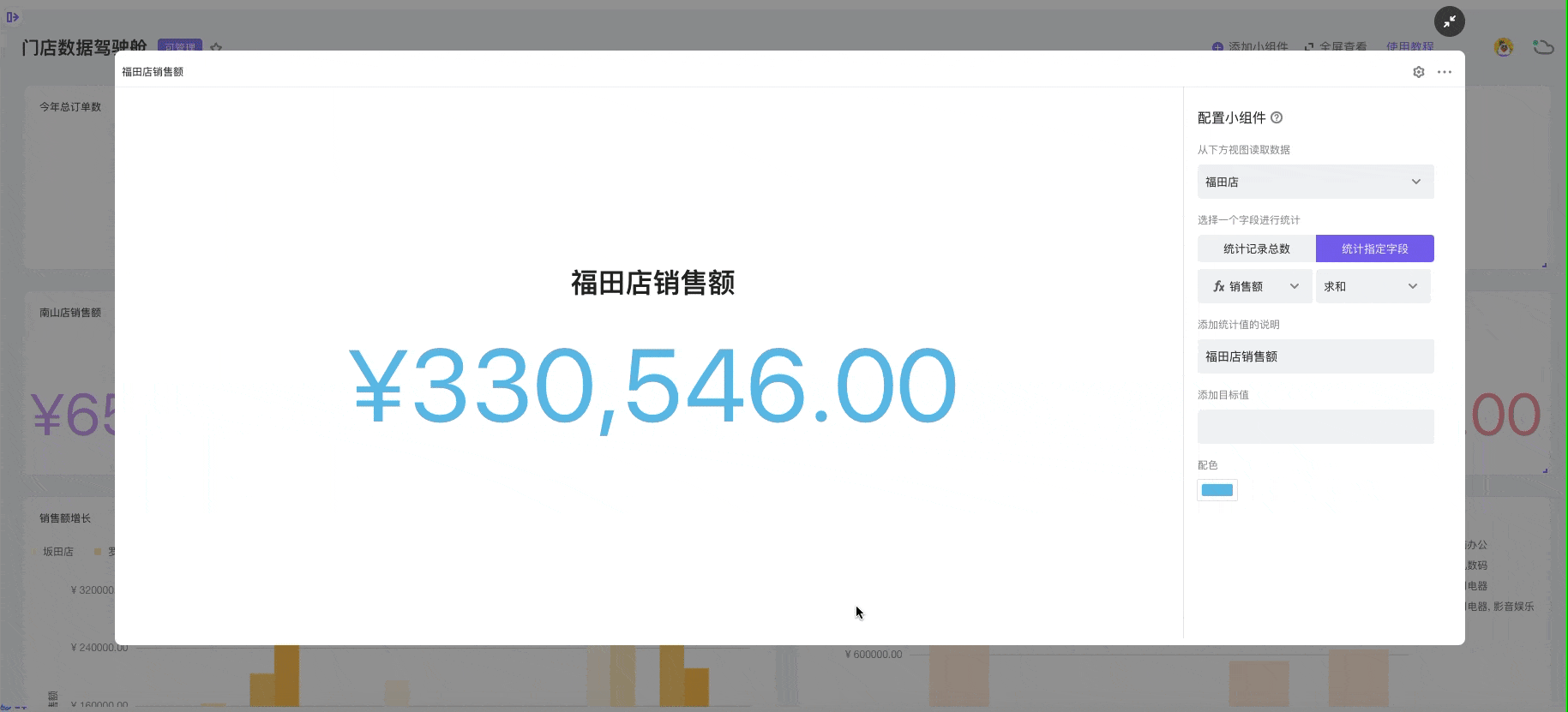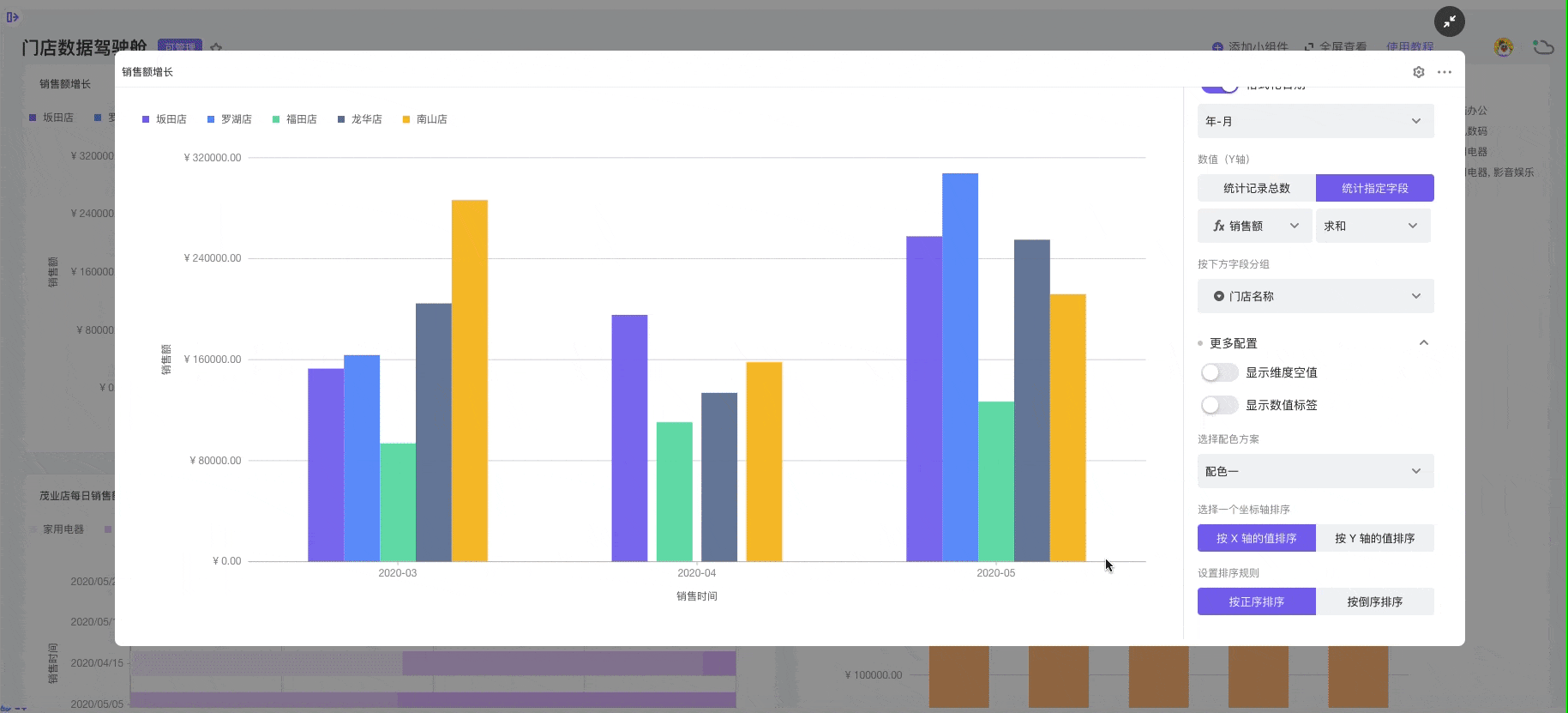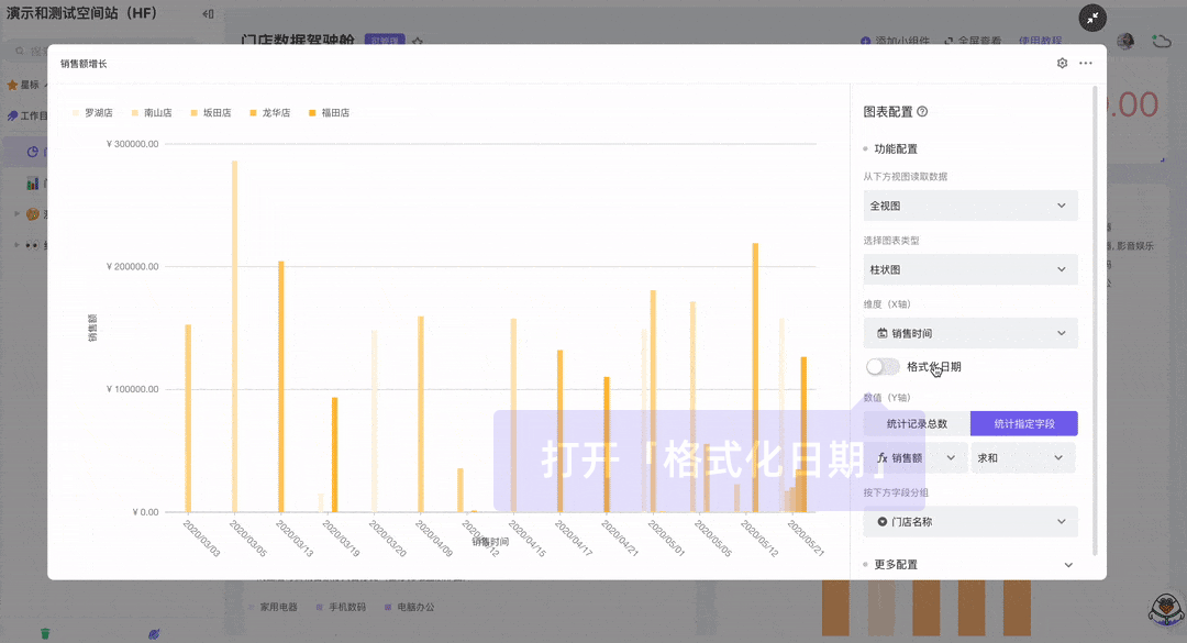 我们以《门店销售》场景为例,如果想要统计所有门店每一个季度的 「销售总额」。只需在「图表」小组件中将 「日期」维度格式化为 「季度」的格式就可以了,当然你还可以按周、年-月、年等方式查看数据。
