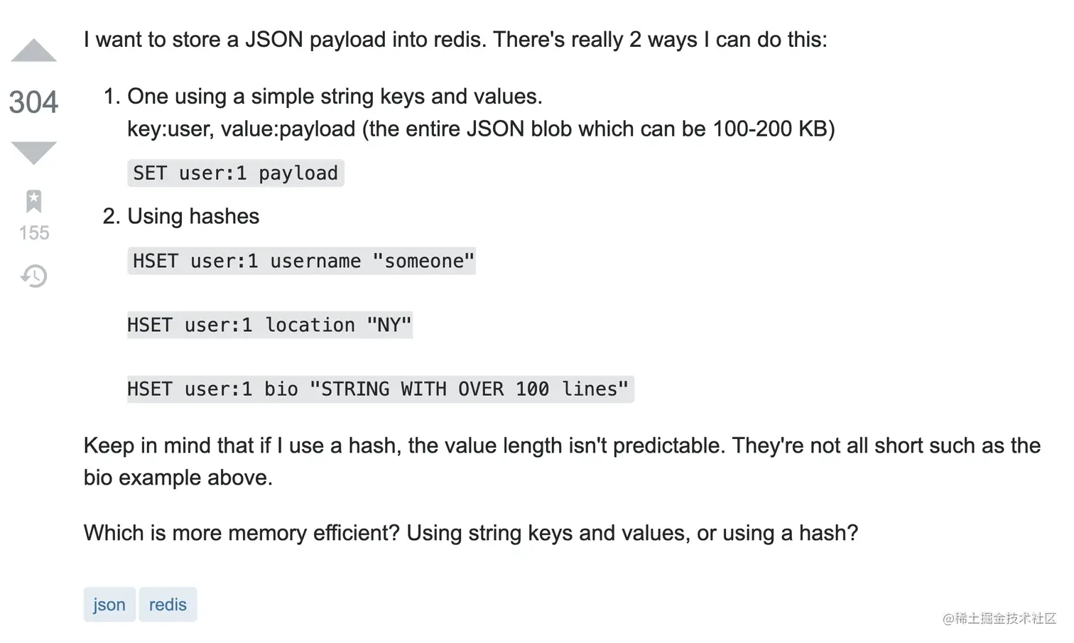 该用户也是同样的疑问, 因为值的长度是不确定的,所以不知道采用string还是hash存储更有效率。