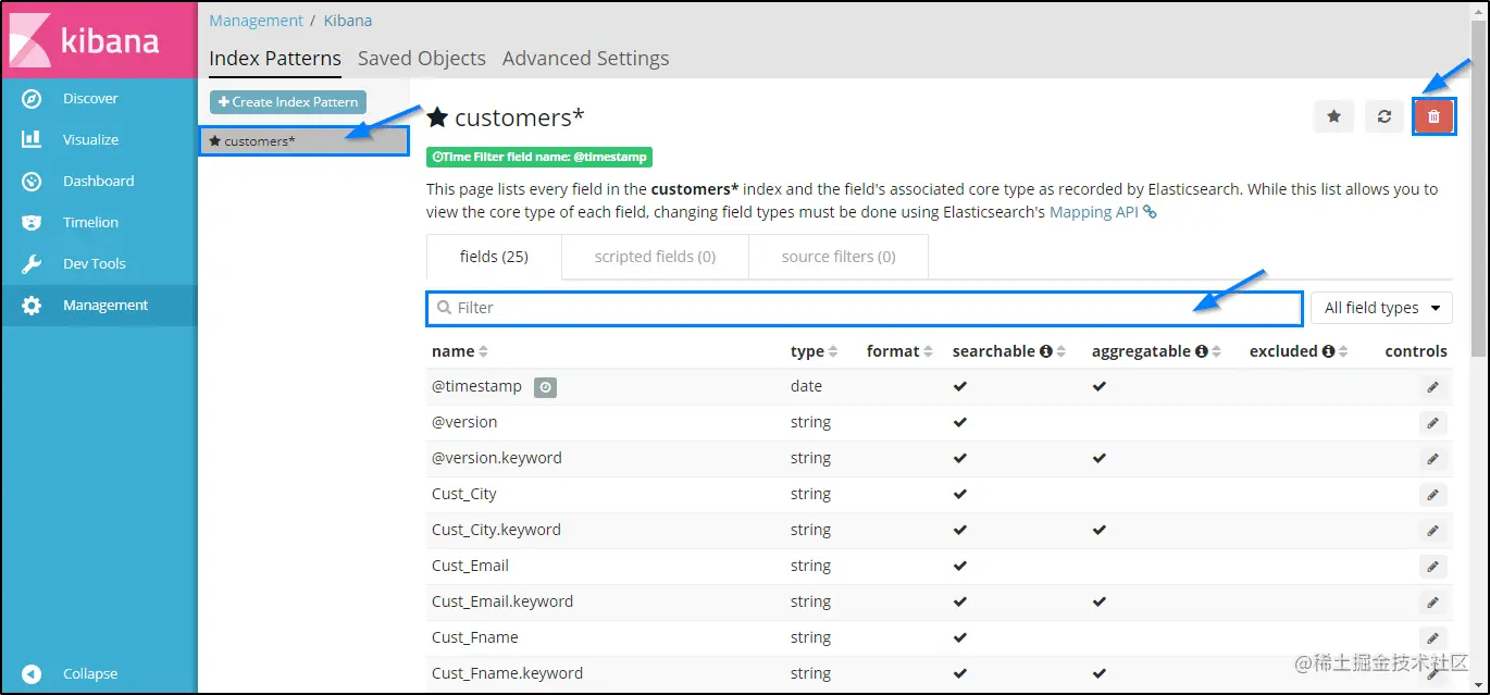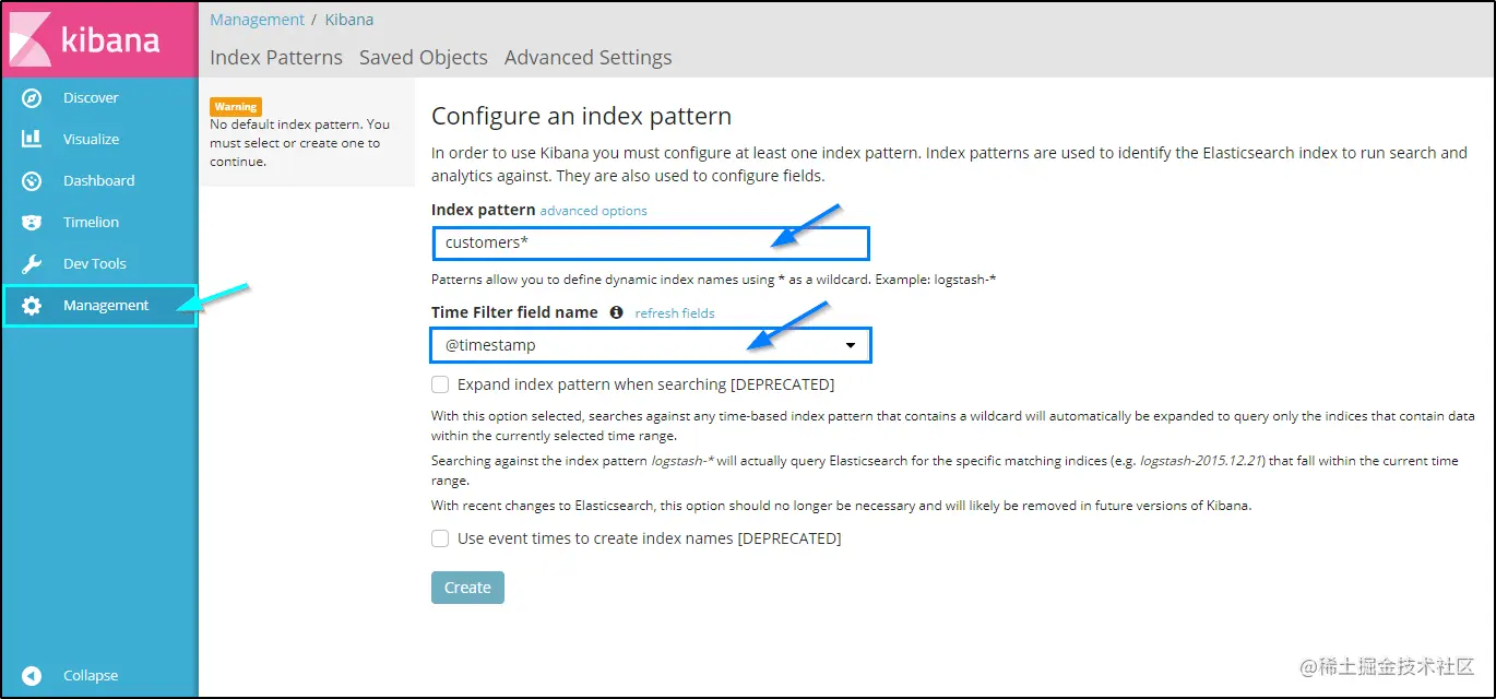 在这里,您必须执行 Kibana 的运行时配置。 在此页面中,您需要指定一些搜索内容。请参见以下示例,在该示例中,我已经配置了“customer”索引的条目。