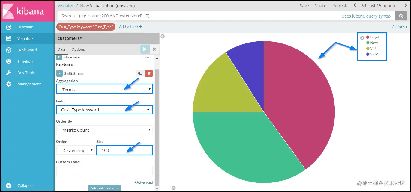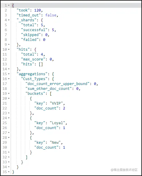 聚合是一个框架,可帮助通过搜索查询聚合数据。小型聚合可以结合在一起,以构建所提供数据的复杂摘要。让我们执行一个简单的汇总,以检查索引中有多少类型的客户: