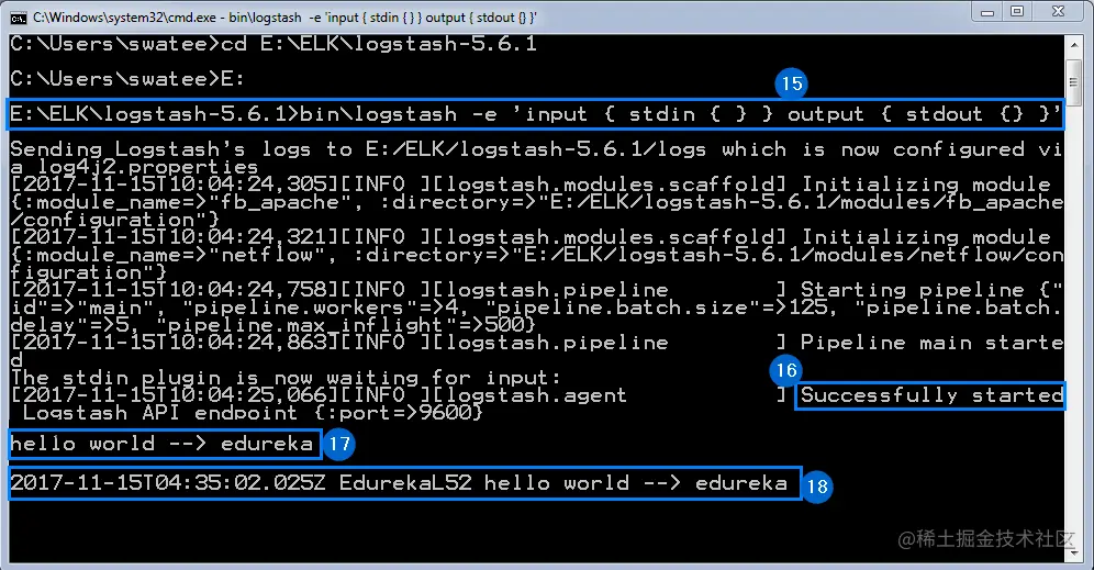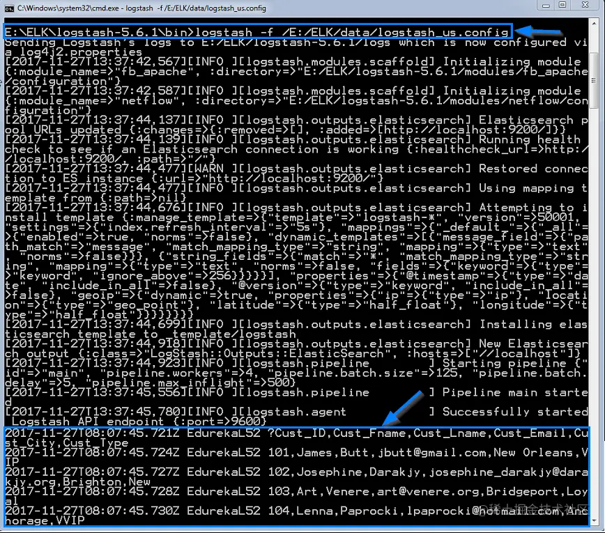 - 输入:logstash –f X:/foldername/config_filename.config 然后按回车。一旦您的 logstash 服务器启动并运行,它将开始将文件中的数据传输到Elasticsearch 中。
