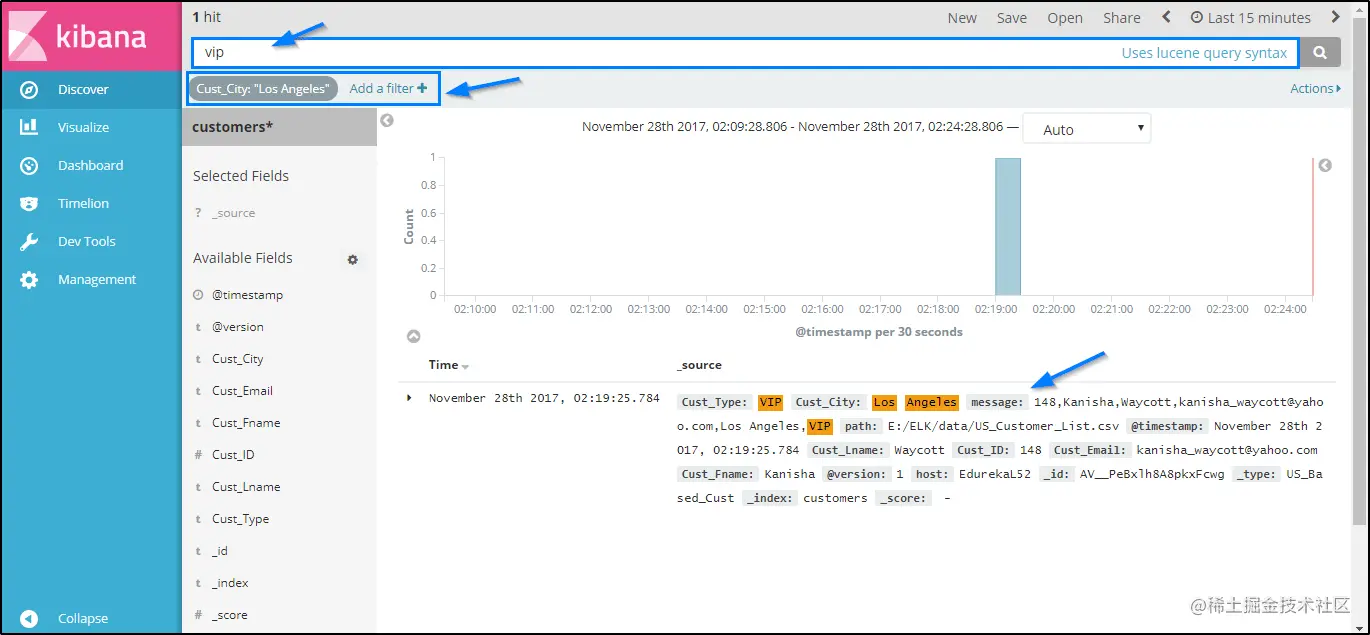 通过“发现”页面,您可以访问存在于每个与所选索引模式匹配的每个索引的文档。 您可以轻松地交互和浏览Kibana服务器上存在的所有数据。 此外,您可以查看文档中存在的数据并对其进行搜索查询。 下面你可以看到,我正在搜索来自“洛杉矶”的“ VIP”客户。