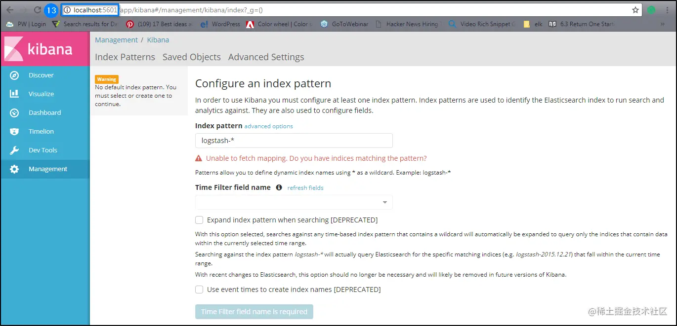 如您所见,在“索引模式(Index Patterns)”字段中,您需要指定要使用的索引。确保在“时间过滤器字段名称”中将其选择为**@timestamp**。然后,您可以继续并单击创建以创建索引。如果索引创建成功,您将看到以下页面类型: