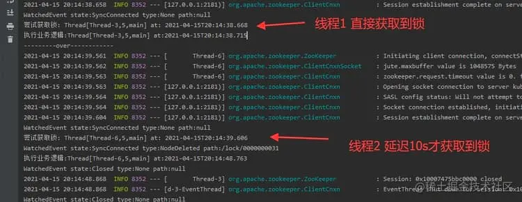 // 获取锁到执行锁会有10s的间隔,因为上面的线程抢占到锁,并持有了10s
