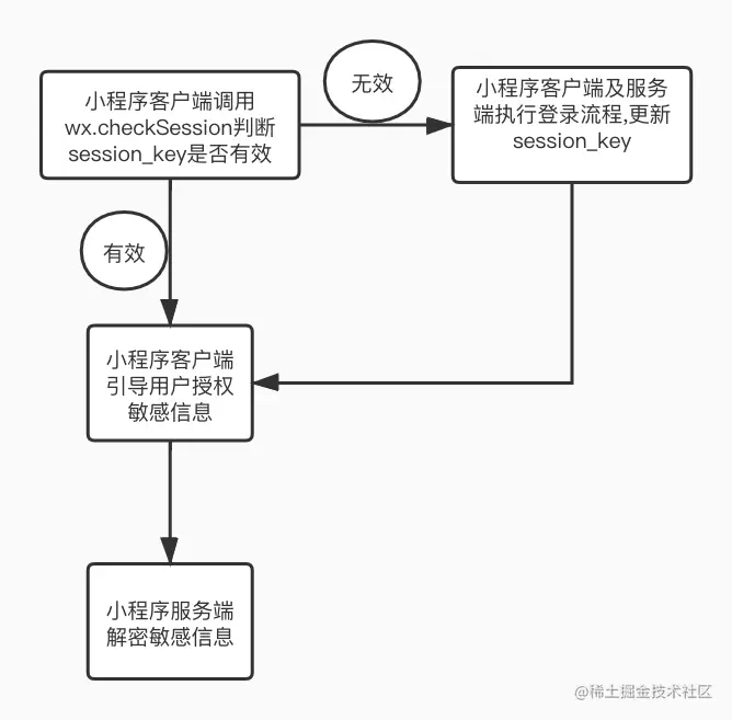 - 开发者在 session_key 失效时,可以通过重新执行登录流程获取有效的 session_key。使用接口wx.checkSession可以校验 session_key 是否有效,从而避免小程序反复执行登录流程。