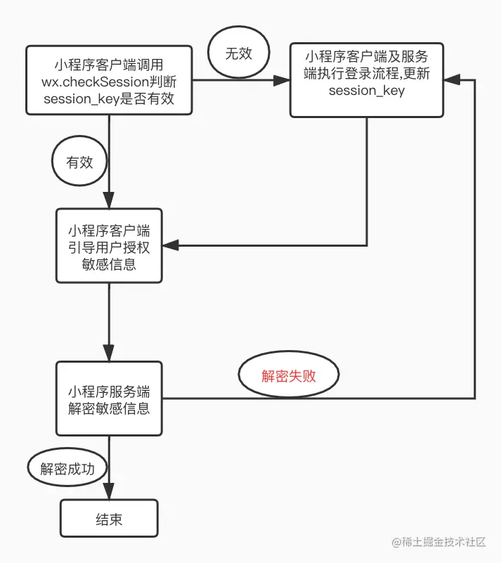 - wx.login调用时,用户的 session_key可能会被更新而致使旧 session_key 失效(刷新机制存在最短周期,如果同一个用户短时间内多次调用wx.login,并非每次调用都导致 session_key 刷新)。开发者应该在明确需要重新登录时才调用wx.login,及时通过auth.code2Session接口更新服务器存储的 session_key。