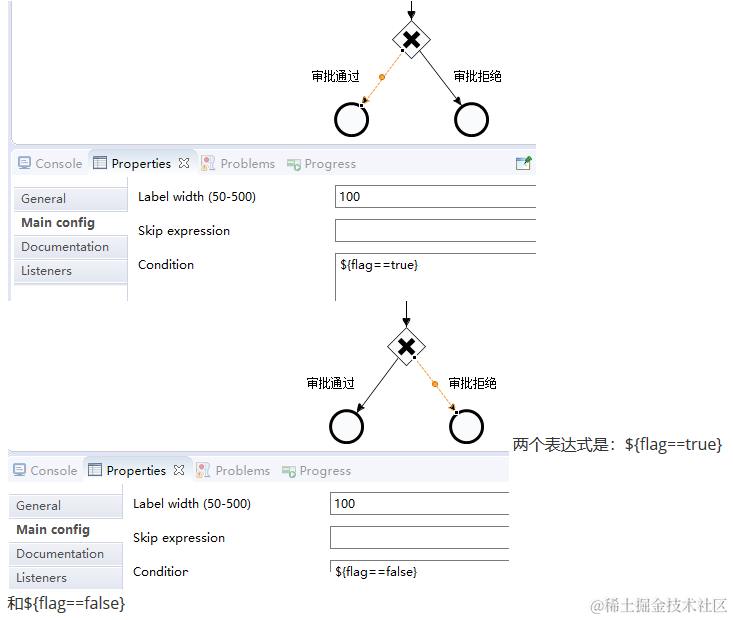 /** * 完成任务 */ @Test public void test7CompleteTaskWithVariables() { List<Task> list = taskService.createTaskQuery() //创建任务查询对象 .processDefinitionKey("MyProcess04")//指定流程定义 .taskAssignee("zhangsan")//指定委托人 .list();//执行查询 for (Task task : list) { String taskId = task.getId(); //在完成当前任务时,为下一个任务指定流程变量 Map<String,Object> variables = new HashMap<String, Object>(); variables.put("flag", "true"); //完成当前任务时为下一个任务指定变量值 taskService.complete(taskId, variables);//完成任务,使任务进入下一步 //Unknown property used in expression: ${sunzi} //taskService.complete(taskId); } } -