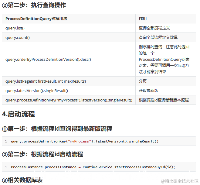 /** * 启动流程 */ @Test public void test05StartProcessInstance() { //1.查询流程定义对象 ProcessDefinition processDefinition = repositoryService.createProcessDefinitionQuery() .processDefinitionKey("MyProcess04") .latestVersion() .singleResult(); //2.获取流程定义的id String processDefinitionId = processDefinition.getId(); //3.使用RunTimeService根据流程定义id启动流程定义 ProcessInstance processInstance = runtimeService.startProcessInstanceById(processDefinitionId); //4.打印processInstance对象 System.err.println(processInstance); } -