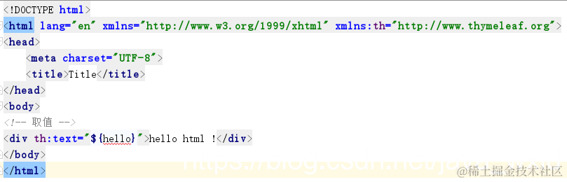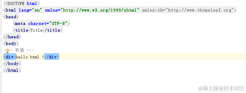 | <html><head><meta charset="utf-8"><title>Freemarker入门小DEMO </title></head><body><#--我只是一个注释,我不会有任何输出 -->${name},你好。${message}</body></html> |