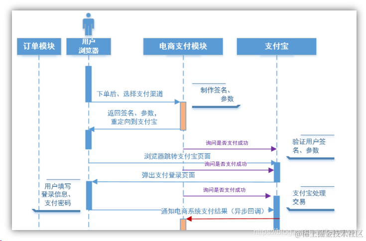 图中紫线部分,就是支付模块一旦帮助用户重定向到支付宝后,就要每隔一段时间询问支付宝用户是否支付成功,直到收到支付宝的回复,或者超过了询问次数。