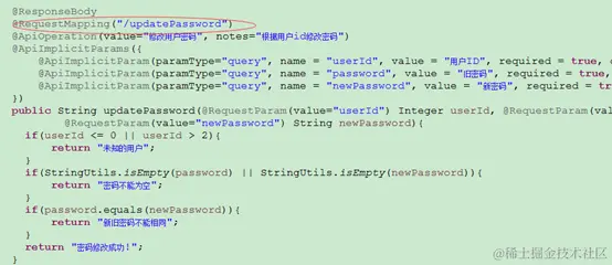 如上图:updatePassword()未指定requestMethod,结果生成了7条API信息。所以如果没有特殊需求,建议根据实际情况加上requestMethod。