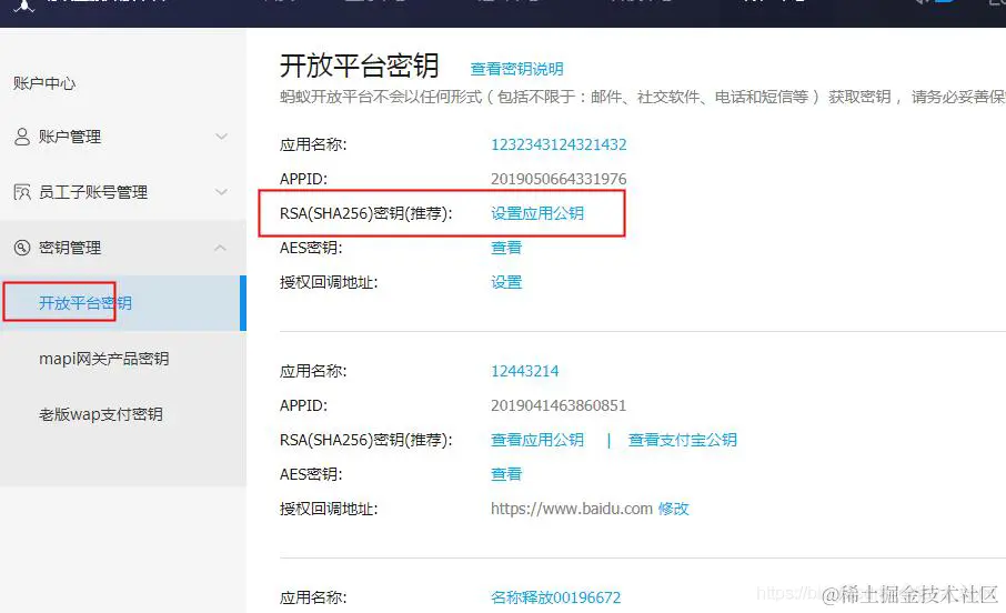 截图这里的是公钥。密钥是您自己生成上传的,生成的是应用私钥和应用公钥。应用公钥上传到开放平台截图位置,上传以后边上会生成一个支付宝公钥。私钥您自己保存。代码中用到的是私钥和支付宝公钥