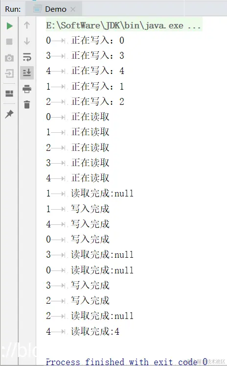 可以看到写的操作原子性和独占性没有得到保证,0线程正在写入共享资源的时候,其他线程有写入和读取的共享资源操作,导致数据不一致。