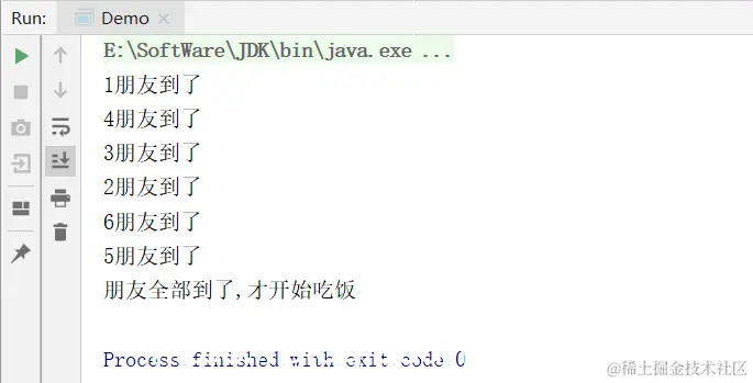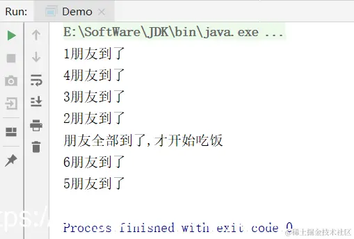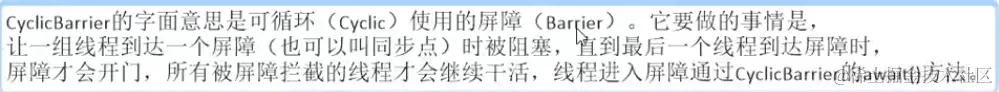 CyclicBarrier cyclicBarrier = new CyclicBarrier(6,()->{System.out.println("朋友全部到了,才开始吃饭");});