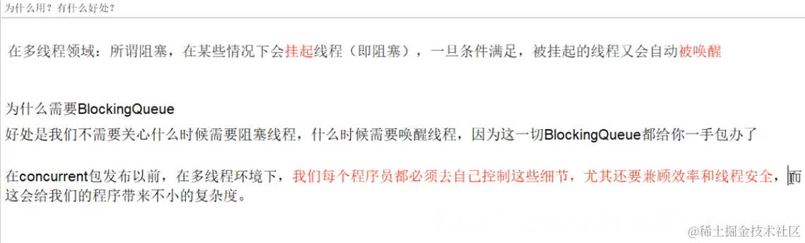 阻塞队列与普通队列的区别在于,当队列是空的时,从队列中获取元素的操作将会被阻塞,或者当队列是满时,往队列里添加元素的操作会被阻塞。试图从空的阻塞队列中获取元素的线程将会被阻塞,直到其他的线程往空的队列插入新的元素。同样,试图往已满的阻塞队列中添加新元素的线程同样也会被阻塞,直到其他的线程使队列重新变得空闲起来,如从队列中移除一个或者多个元素,或者完全清空队列,下图展示了如何通过阻塞队列来合作: