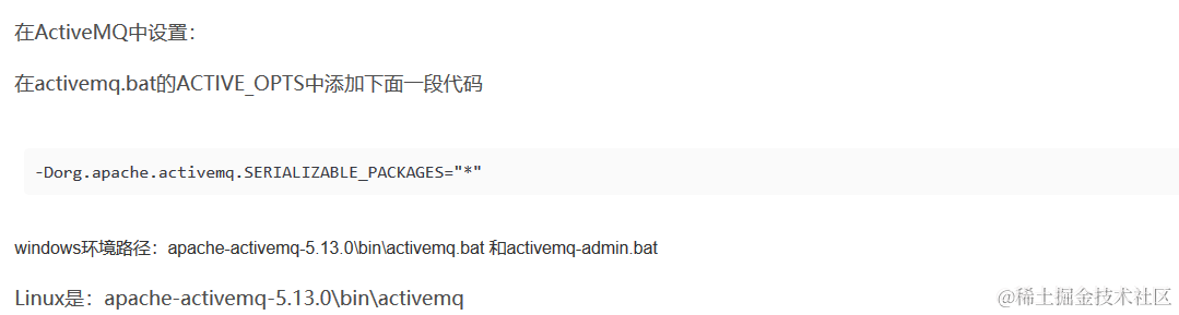 objectMessage对象依赖于marshal/unmarshal对象负载的Java序列化。此进程通常被认为是不安全的,因为恶意负载可以利用主机系统进行攻击。这就是为什么从版本5.12.2和5.13.0开始,ActiveMQ强制用户显式地列出可以使用ObjectMessages交换的包的白名单。