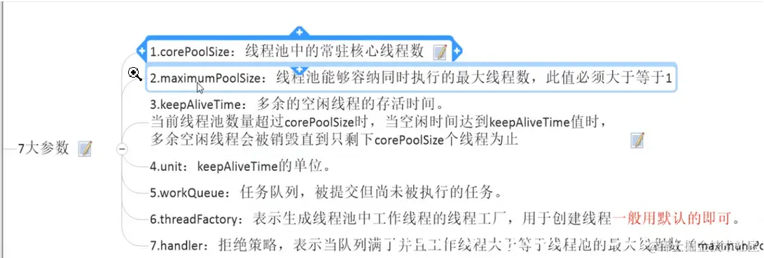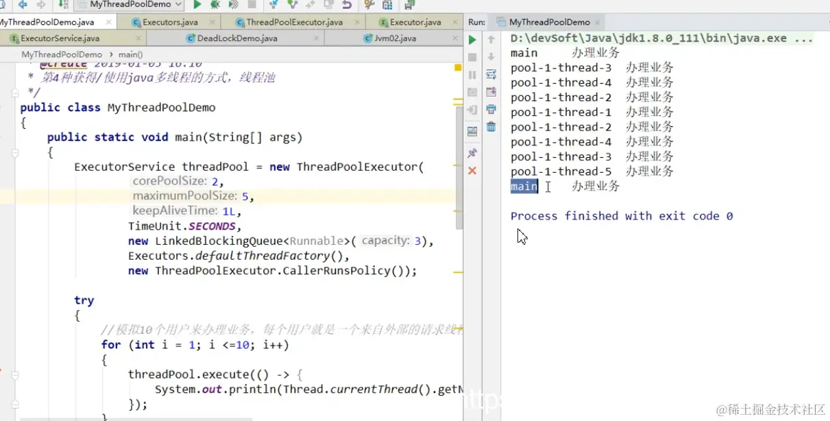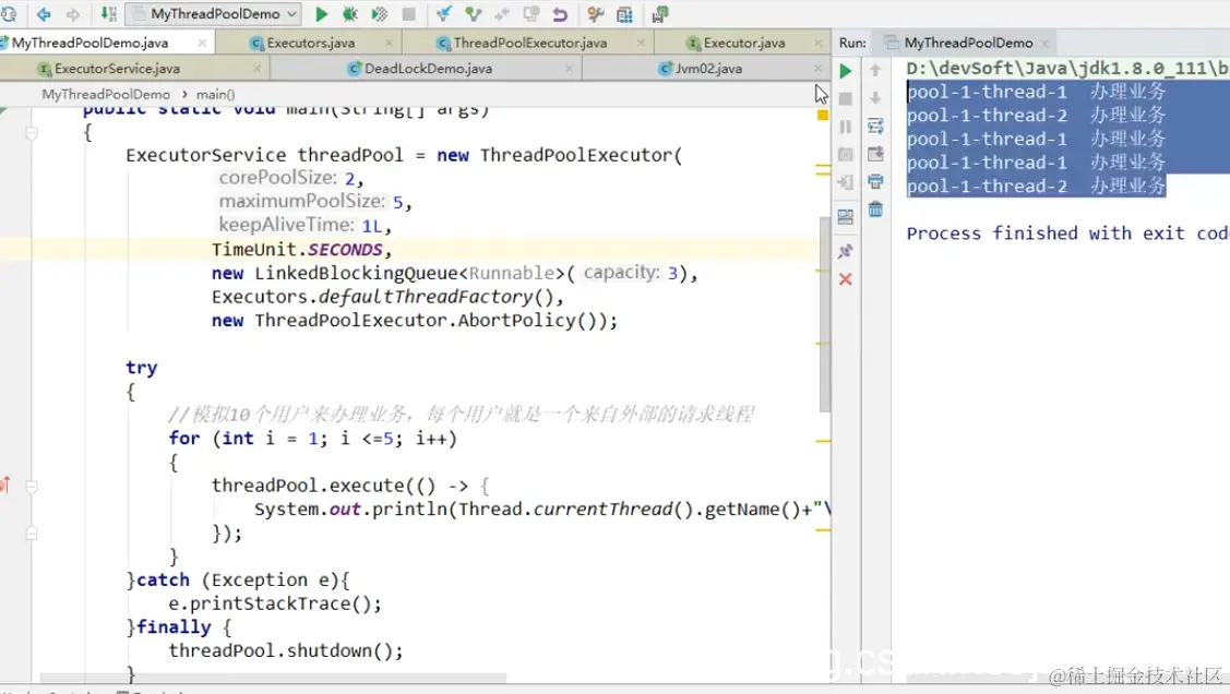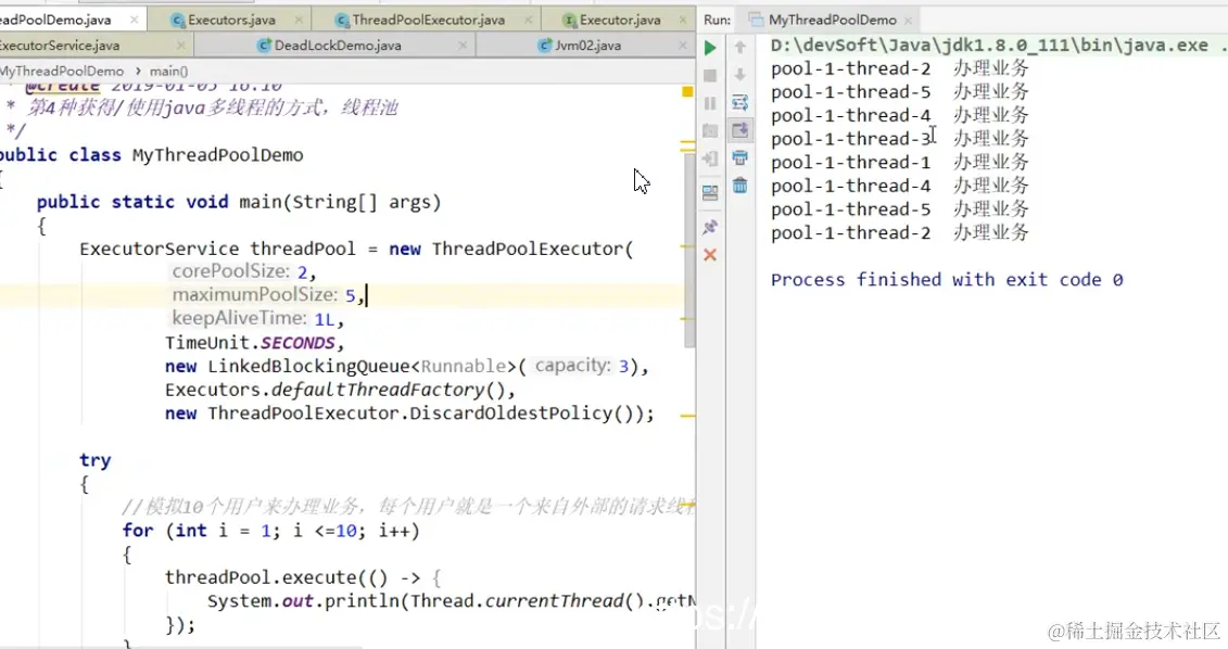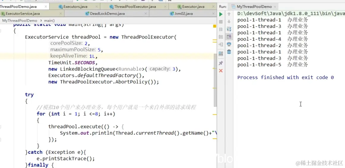 现在创建它:核心线程数2,同时执行的最大线程数5,多余线程存活时间1L,单位秒,阻塞队列3,默认线程工厂,拒绝策略