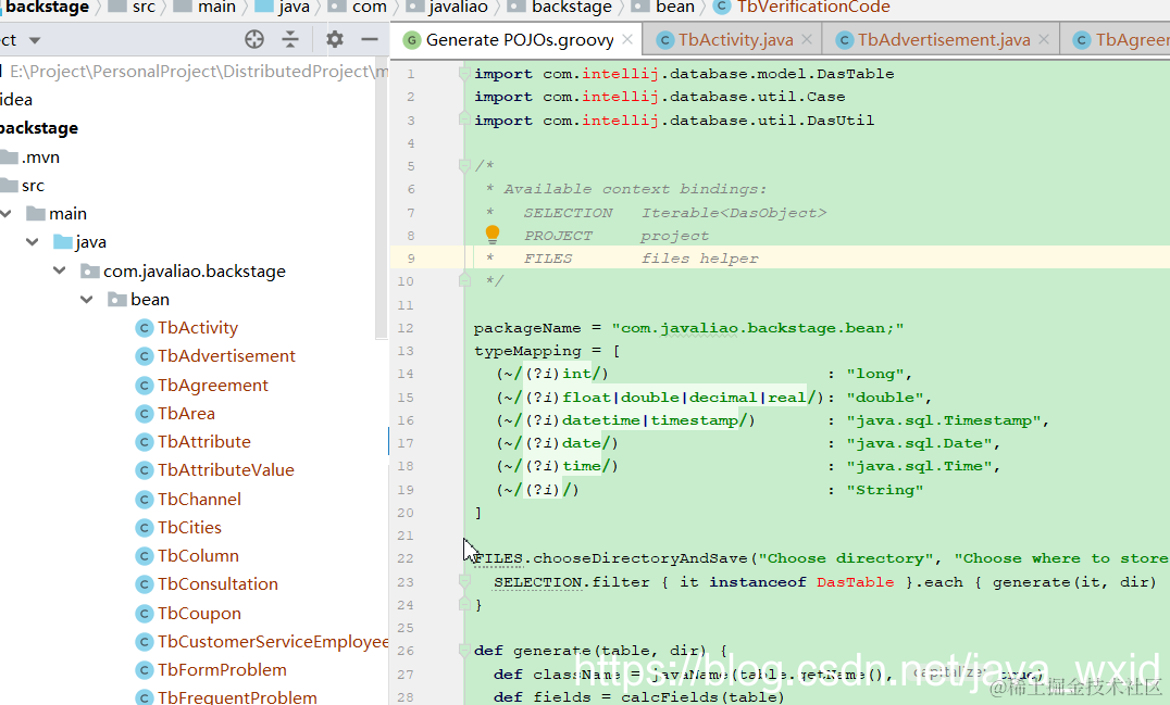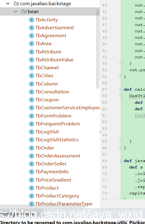 开发工具:第五章:使用idea生成实体类 我是廖志伟 2021-04-28 274 阅读1分钟 由于最近做的一个分布式电商项目的后台有提到一个使用idea生成实体类,所以这里详细图文讲解一下 测试连接 ,注意加后缀?useSSL=false&serverTimezone=UTC 选中所要生成的 修改包路径 生成后: