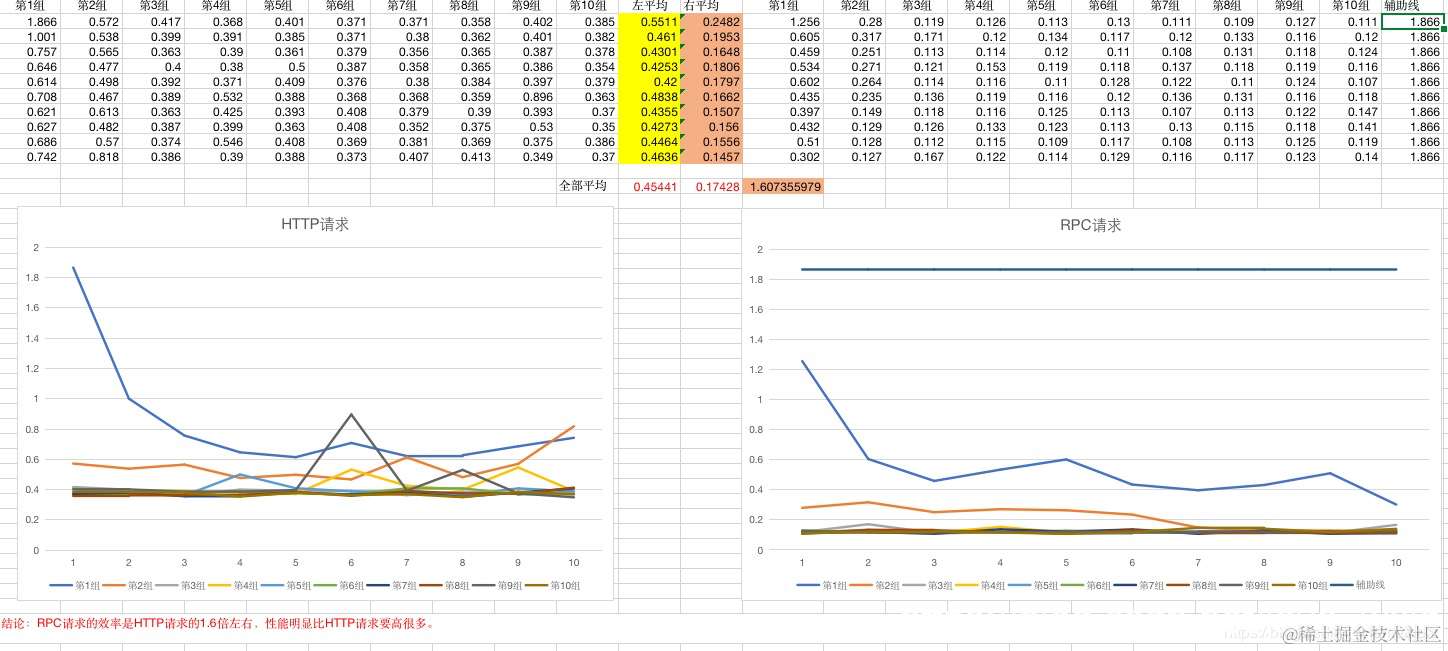 结论:RPC请求的效率是HTTP请求的1.6倍左右,性能明显比HTTP请求要高很多,因为HTTP协议包含大量的请求头、响应头信息。